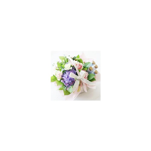 다양한 플라워 소재를 사용해서 로맨틱한 색감으로 러블리하게 연출한 꽃바구니예요.
