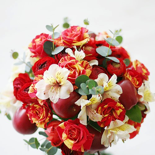동화속 공주 중 유일하게 흑발 머리인 백설공주를 컨셉으로 연출한 꽃다발이에요.