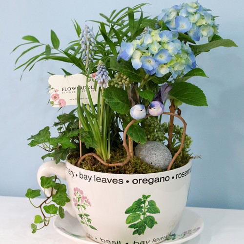 봄꽃인 무스카리와 조금 일찍 만나보는 수국으로 컬러의 포인트를 주어서 미니 가드닝을 연출했어요.